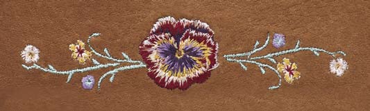 Scroll down to see all Embroidery Designs Fireweed - G558 Blooming Pansies - G803 Wild Flowers - G086 Rose Lace - G554 Sunflower - G810 Forget-Me-Nots - G816 Pine Cone - G807 Tree Grove - G806 Mare & Foal - G234 Three Running Horses - G025 Single Running Horse - G056 Windy Day - G612 Morning Run - G800 Cardinal - G051 Chickadee - G626 Gold Finch - G090 Blue Bird - G808 Hummingbird - G001 Rufous Hummer - G812 Eagle Landing - G053 Eagle Head - G620 Mallard - G018 Loon - G614 Dragonfly - G616 Monarch - G618 Wolf Smile - G622 Wolf Watch - G145 Deer Head - G801 Elk Head - G083 Elk Bugle - G540 Feathers - G099 Kokopelli - G232 Feather - G100 Dream Catcher - G802 Geometric Rug - G226 Fetish Bear - G606 Standing Buffalo - G062 White Buffalo - G805 Polar Cuddle - G108 Black Bear - G200 Grizzly w/Fish - G060 Moose - G815 Sea Turtle - G044 Jumping Dolphin - G007 "Pink Ribbon"