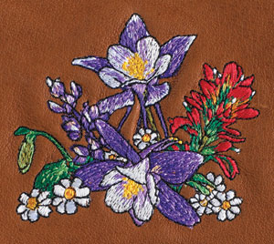 Scroll down to see all Embroidery Designs Fireweed - G558 Blooming Pansies - G803 Wild Flowers - G086 Rose Lace - G554 Sunflower - G810 Forget-Me-Nots - G816 Pine Cone - G807 Tree Grove - G806 Mare & Foal - G234 Three Running Horses - G025 Single Running Horse - G056 Windy Day - G612 Morning Run - G800 Cardinal - G051 Chickadee - G626 Gold Finch - G090 Blue Bird - G808 Hummingbird - G001 Rufous Hummer - G812 Eagle Landing - G053 Eagle Head - G620 Mallard - G018 Loon - G614 Dragonfly - G616 Monarch - G618 Wolf Smile - G622 Wolf Watch - G145 Deer Head - G801 Elk Head - G083 Elk Bugle - G540 Feathers - G099 Kokopelli - G232 Feather - G100 Dream Catcher - G802 Geometric Rug - G226 Fetish Bear - G606 Standing Buffalo - G062 White Buffalo - G805 Polar Cuddle - G108 Black Bear - G200 Grizzly w/Fish - G060 Moose - G815 Sea Turtle - G044 Jumping Dolphin - G007 "Pink Ribbon"